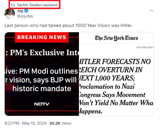 He has cited one of the articles from the Propaganda website, Newslaundry, as a reference.