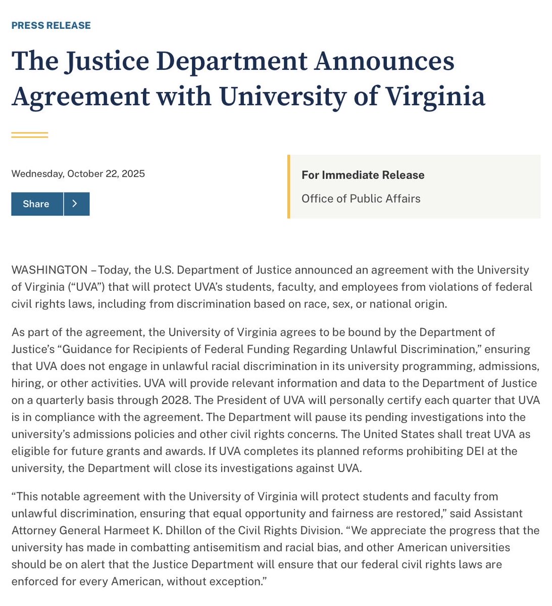 /2 The agreement requires UVA to end race-, sex-, and identity-based discrimination across its operations, report compliance data through 2028, and certify in writing quarterly that every department is in full compliance with federal civil rights laws.