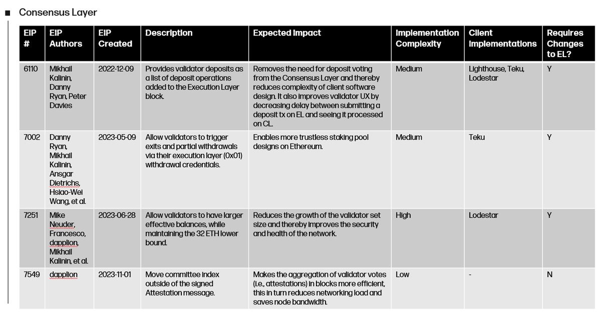 - PeerDAS (not incl. in the chart below b/c technically it doesn't require a hard fork, if it does end up being ready, they'll also change the blob count and that will have to be a new EIP)