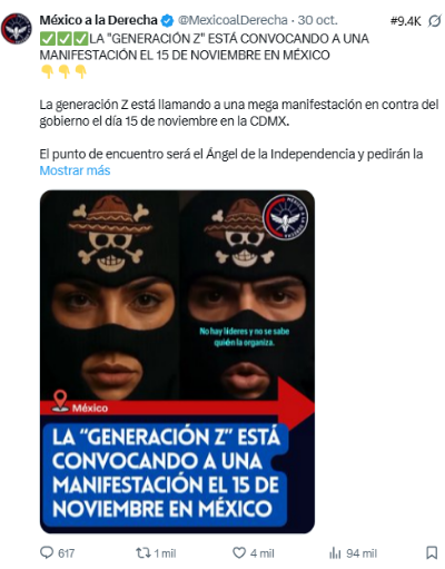 Todo comienza por una convocatoria de una cuenta de X para el 15 de noviembre para pedir la revocación de la presidenta. La cuenta fue creada en agosto de 2024 y había apoyado a la oposición venezolana, pero el 15 de octubre reactivó la cuenta con el nombre GeneraciónZ Mx.