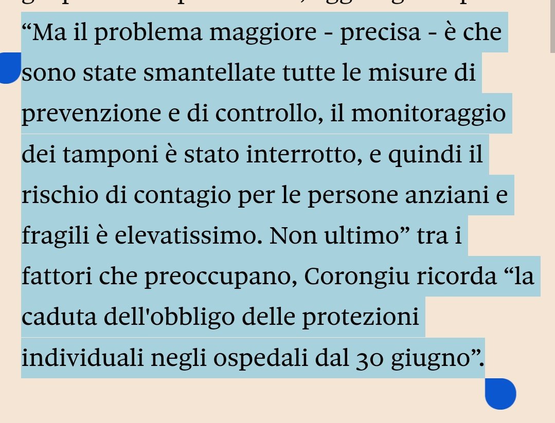 “Ma il problema maggiore è che sono state smantellate tutte le misure di prevenzione e di controllo, il monitoraggio dei tamponi è stato interrotto, e quindi il rischio di contagio per le persone anziani e fragili è elevatissimo.