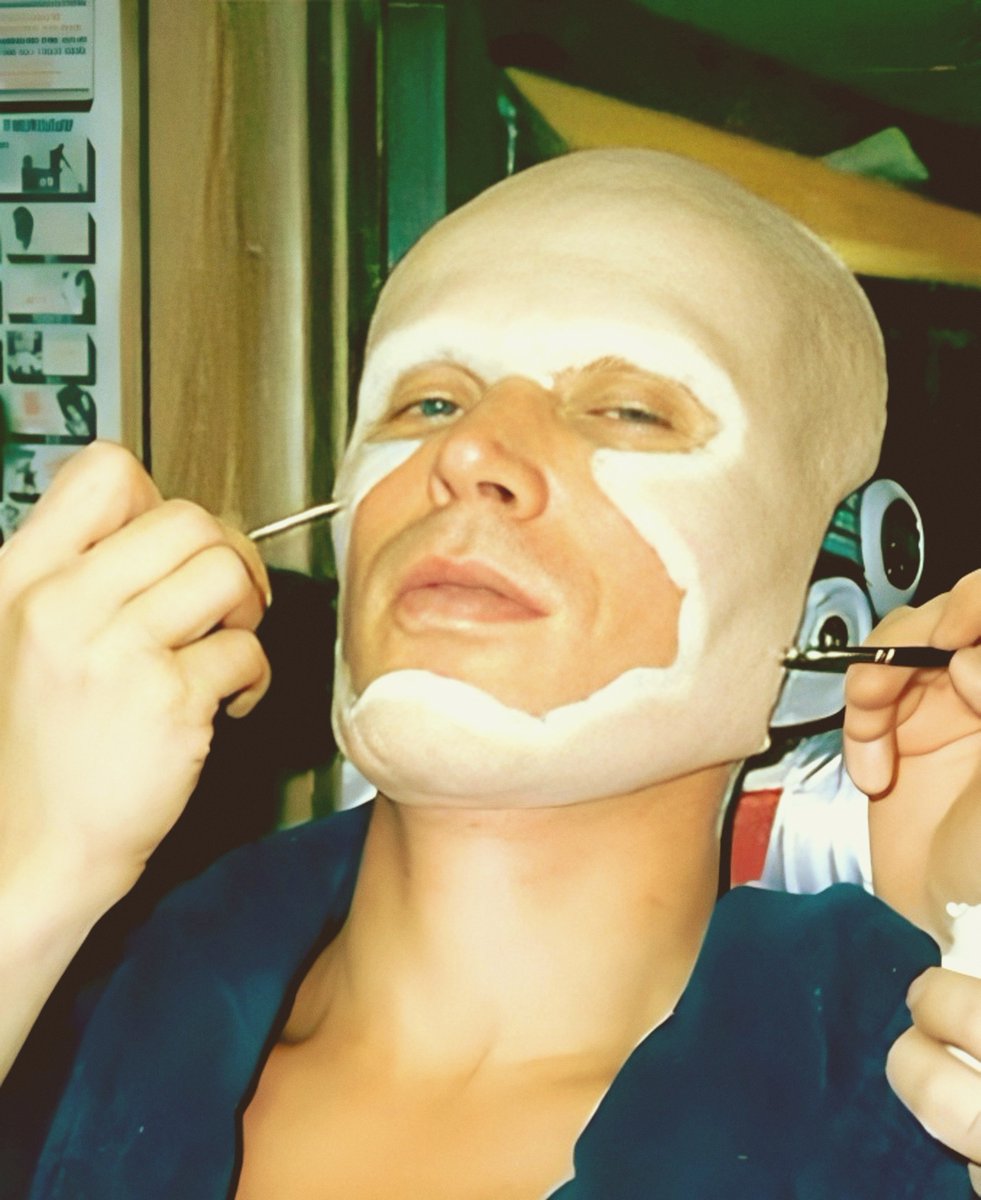 Weller wore a bald cap to allow for the helmet to go on easily. Bottin created a flexible undersuit then a harness where you could hang solid pieces of the fibre glass exoskeleton. The suit was then attached to Weller in stages.