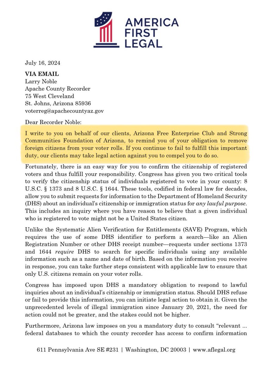 We sent the letters on behalf of our clients, Arizona Free Enterprise Club and Strong Communities Foundation of Arizona, and demands that election officials fulfill their legal obligations to prevent aliens from voting.