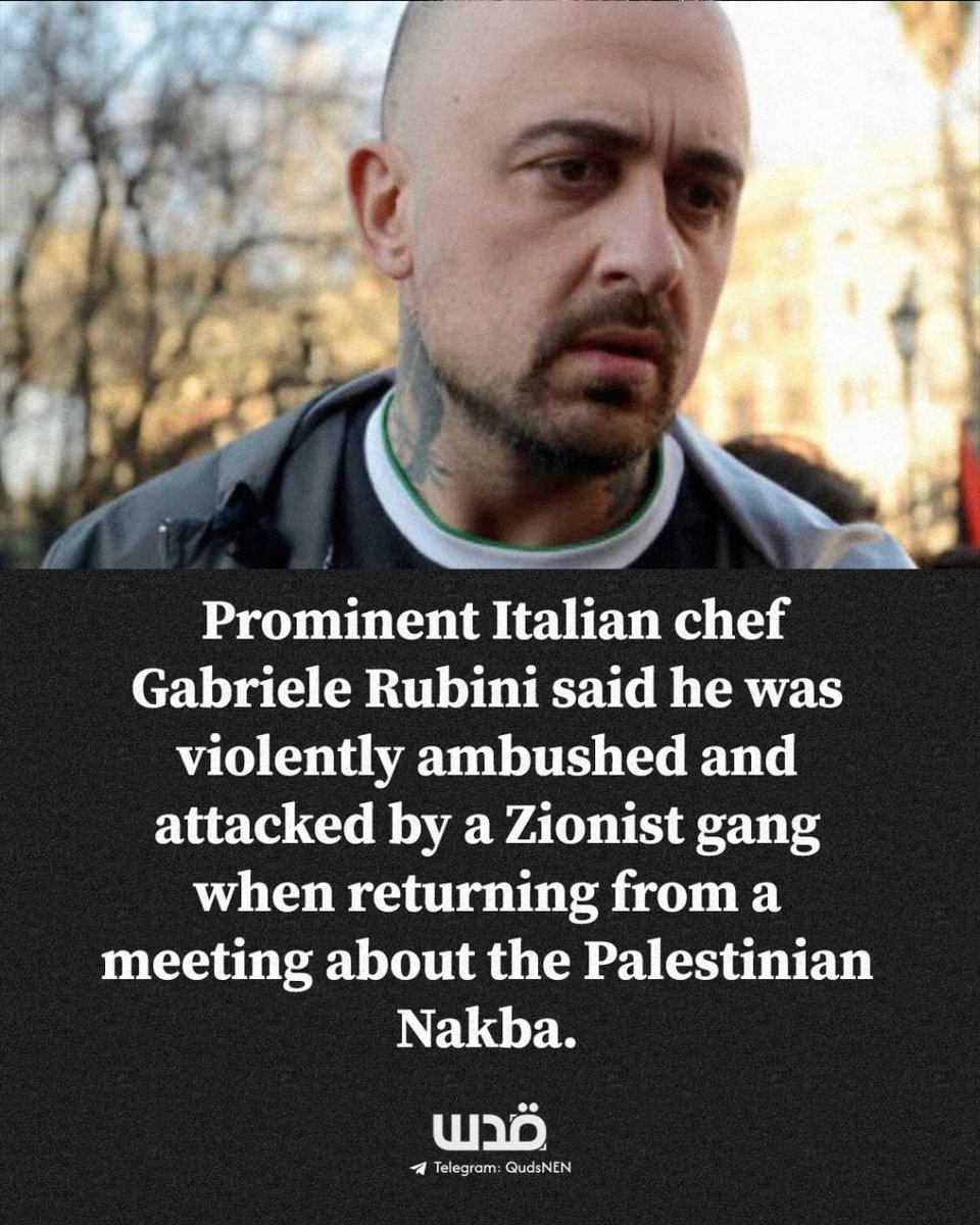 Prominent Italian chef Gabriele Rubini said he was violently ambushed and attacked by a Zionist gang when returning from a meeting about the Palestinian Nakba.
