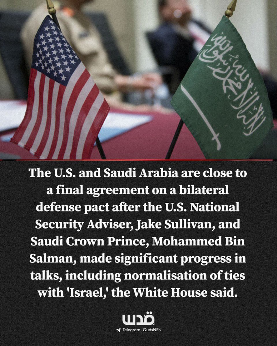 The U.S. and Saudi Arabia are close to a final agreement on a bilateral defense pact after the U.S. National Security Adviser, Jake Sullivan, and Saudi Crown Prince, Mohammed Bin Salman, made significant progress in talks, including normalisation of ties with 'Israel,' the White House said.