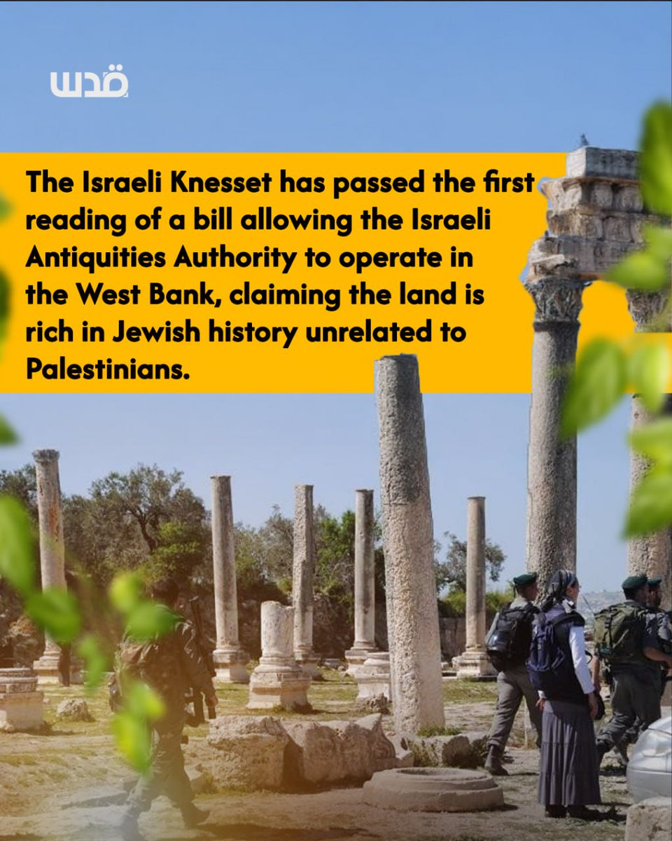 The Israeli parliament has approved an initial stage of legislation that permits the Israeli Antiquities Authority to conduct operations in the West Bank. The move would further Israel's erasure and theft of Palestinian history.