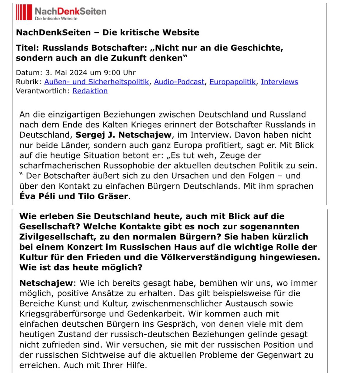 Auch die Zusammenarbeit mit der Agentur „Russia Today“, die eine Videokonferenz mit Dubow abhielt, erwähnte die «Berliner Zeitung» nicht.