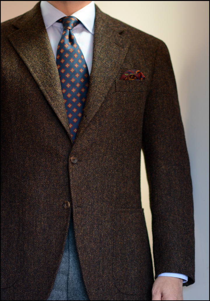 Another way is to choose a square with a main color that complements your tie. Easy way to think of this is the color wheel—colors directly opposite or adjacent typically complement. Here's a brown tie with a green pocket square.