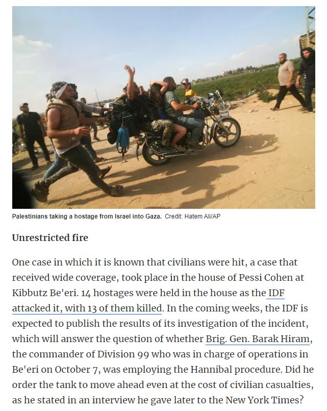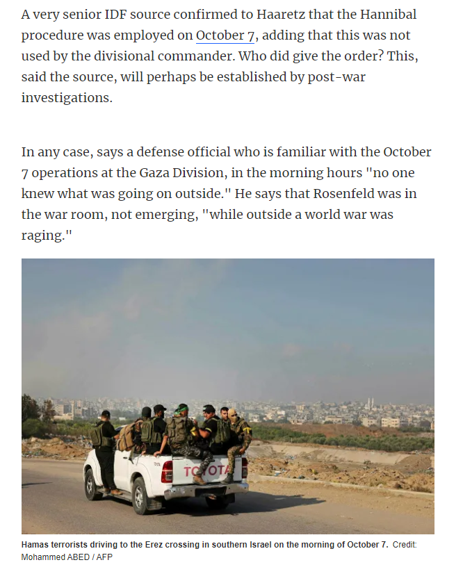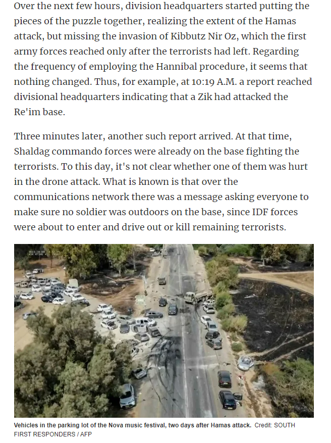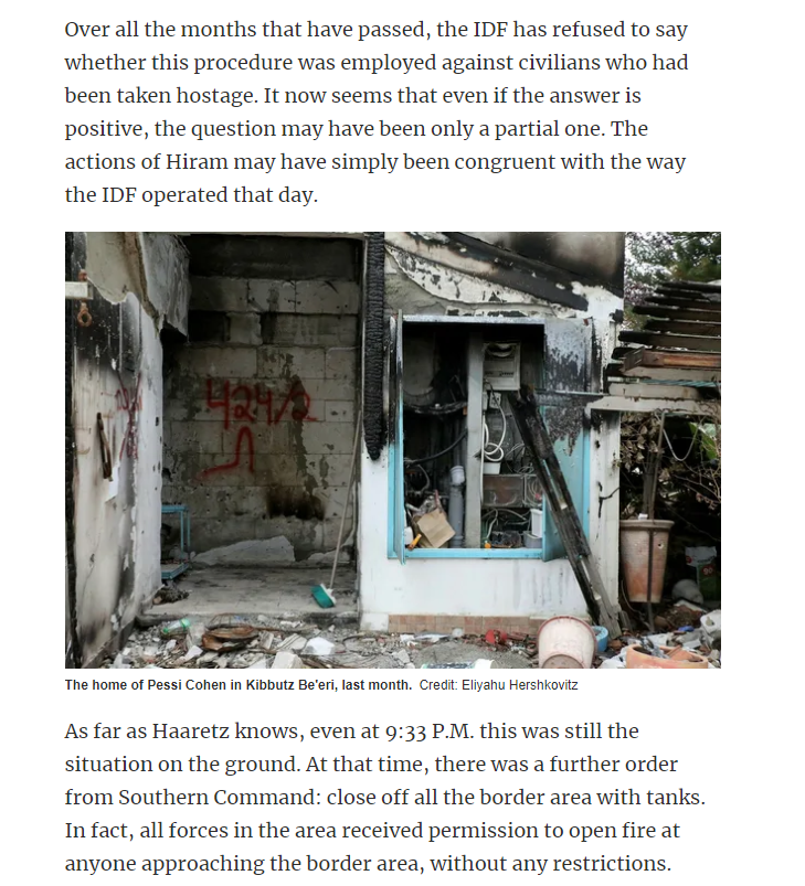 It relates to the orders given to soldiers on October 7th to fire on any vehicle seeking to return to the Gaza Strip to prevent the taking of hostages and was published on July 7th, 10 months later in Haaretz.