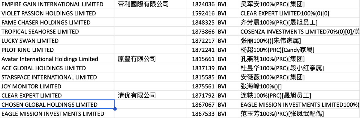 @thewirechina @NorthropKatrina @eliotcxchen @DavidBarboza2 @QianIsabelle @muyixiao @vwang3 Xiao controlled his empire via proxies - often employees or their relatives - so his fingerprints were not on the deals. But the docs include a spreadsheet listing all of the offshore companies he controlled. (10/x)