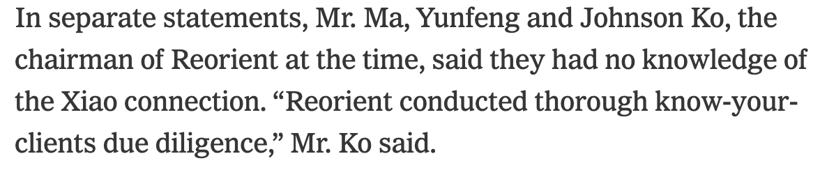 @thewirechina @NorthropKatrina @eliotcxchen @DavidBarboza2 @QianIsabelle @muyixiao @vwang3 And, it is important to note, that Jack Ma and Alibaba say they were unaware of Xiao's investments into Alibaba, Alibaba Pictures and other entities. This is what they said. (30/x)