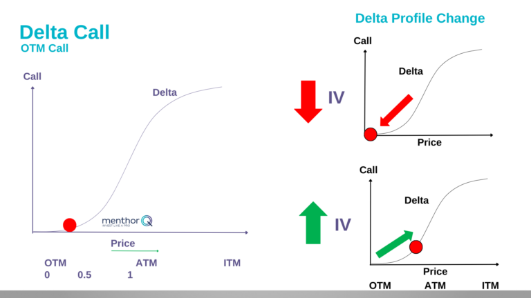 As volatility increases, the delta of that call option will change. In a low volatility environment, our OTM call will move deeper OTM. The opposite happens if volatility increases. All of a sudden the OTM call starts moving closer towards the at money. Why? Because higher volatility means that the probabilities of the call moving ATM are higher. Higher volatility means that there is more movement in the market, and more action. In a low volatility environment our OTM call has very low probabilities of being able to get to the ATM strike – there is no gas in the tank.