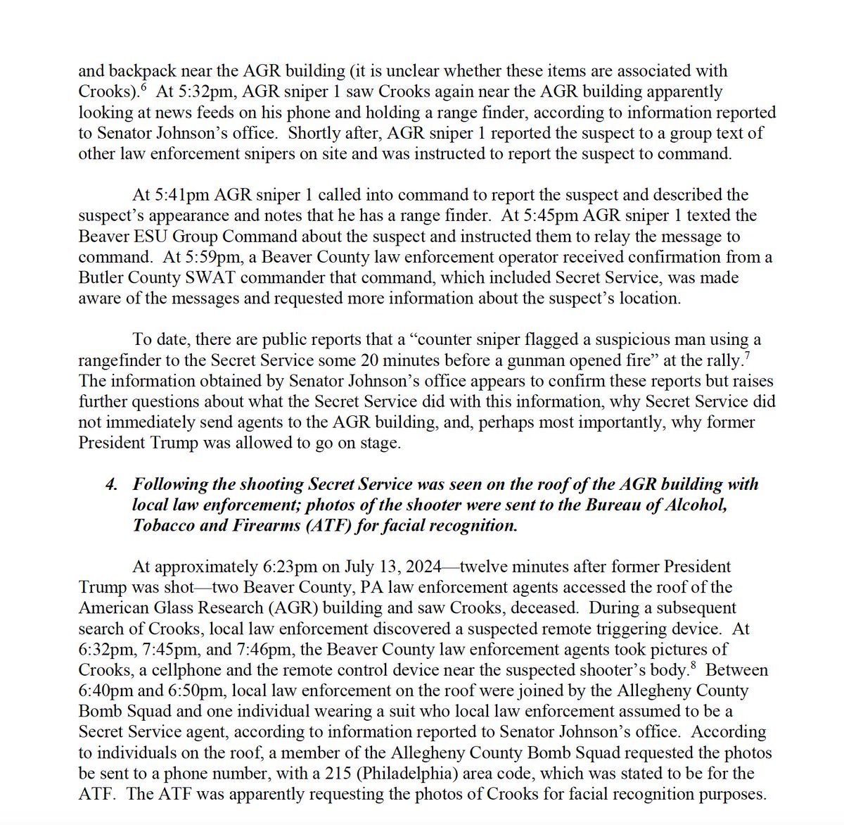 4. Following the shooting Secret Service was seen on the roof of the AGR building with local law enforcement; photos of the shooter were sent to the Bureau of Alcohol, Tobacco and Firearms (ATF) for facial recognition.