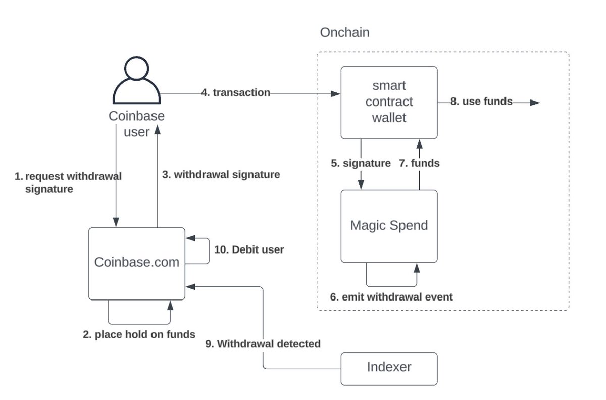 5-7) The “Magic Spend” contract is controlled by Coinbase and has authority to withdraw from Coinbase’s pile of $USDC on Optimism — so it sees the signature that Coinbase itself gave to the user in step #3 and says “ok cool, I (Coinbase) authorized this, so I’m gonna let this user draw down 50 $USDC from our big pool of coins." The contract will also emit an event saying “hey this user took that signature and actually withdrew the $50 they requested.”
