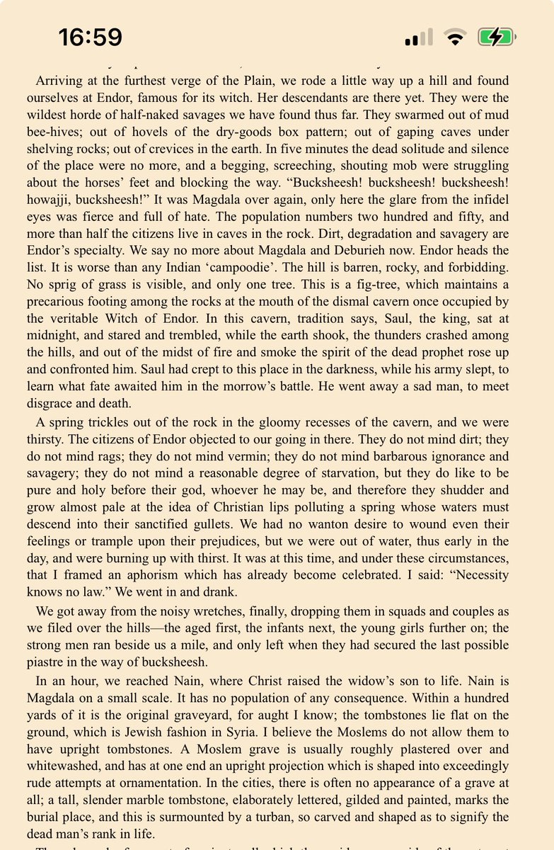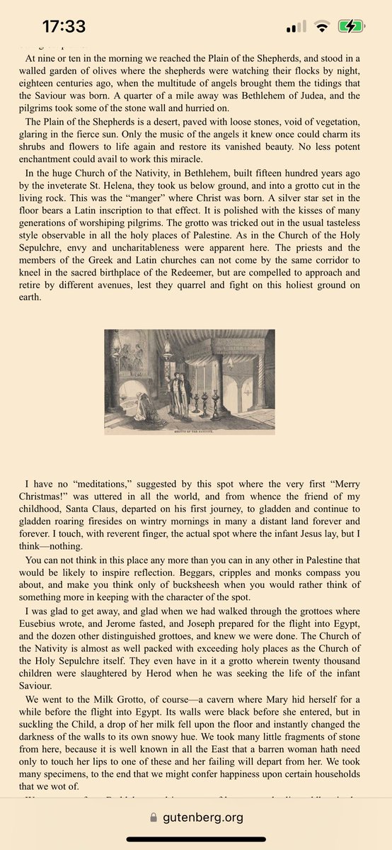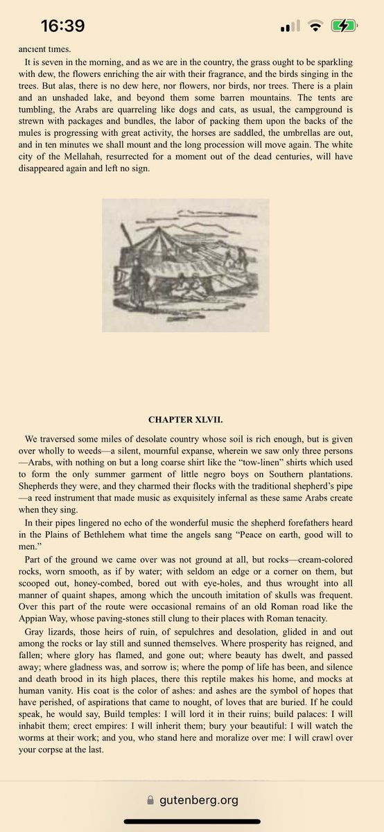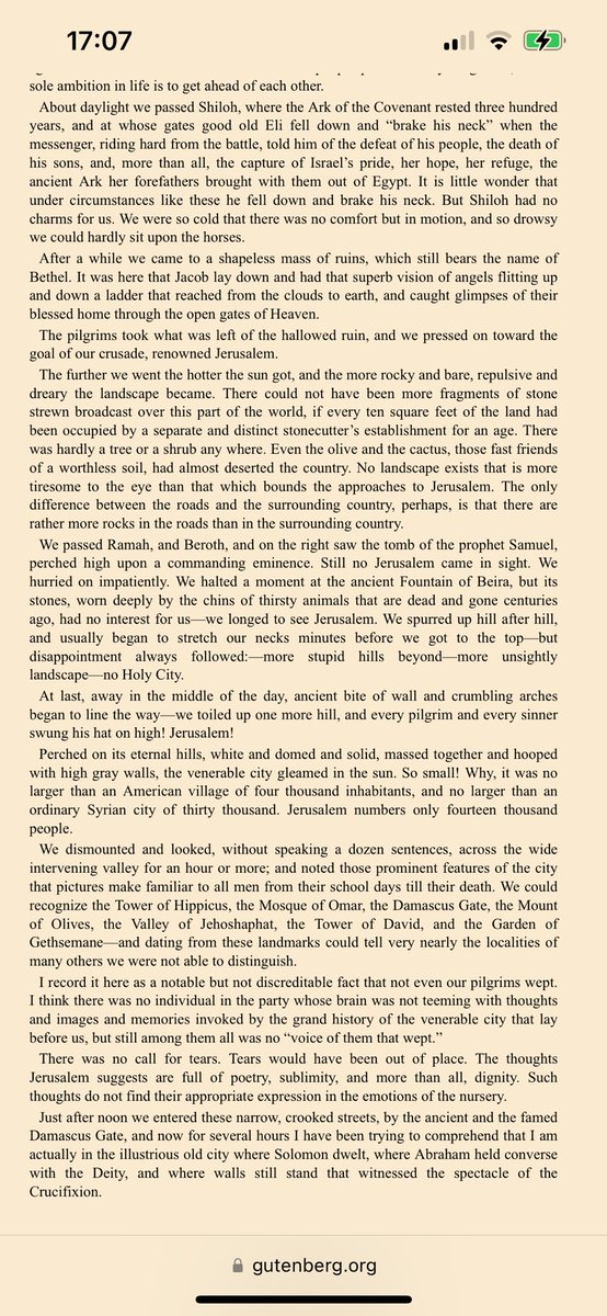 Un viaggio dunque molto deludente: "La Palestina è desolata e brutta. E perché dovrebbe essere altrimenti? La condanna della divinità può forse rendere bella una terra? La Palestina non è più di questo mondo terreno. È sacra alla poesia e alla tradizione; è terra di sogno". 19/n