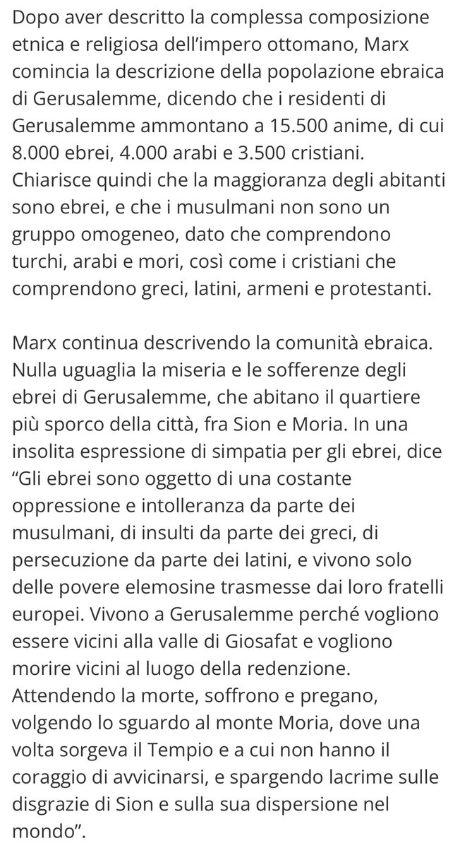 Ma anche Karl Marx che aveva gli ebrei in notevole antipatia, in un articolo su Gerusalemme scritto nel 1854, per il New York Daily Tribune, allora il più importante giornale progressista degli Stati Uniti, scrive: