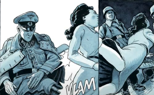 Whilst in the ditch, Madeleine felt the first spark of resistance, but the veritable flame was lit later when a group of German soldiers at a train station began harassing her. Hearing the commotion, an officer appeared and berated the men, but then kicked Madeleine's behind and sent her sprawling. Incandescent with rage and humiliation, she vowed revenge. 4/10