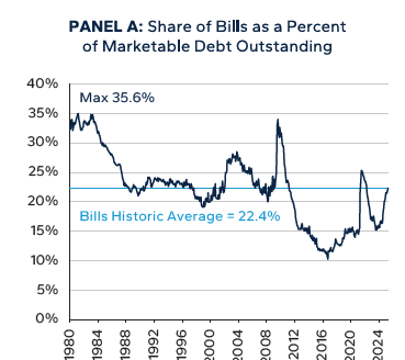 Treasury has an established rule of issuing 15% to 20% of debt in short-term bills rather than interest-rate-risk bearing intermediate/long-term debt (“coupons”).