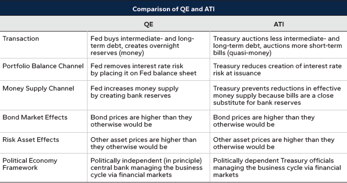 QE functions by hiding bonds and interest rate risk away on the Fed’s balance sheet, and ATI functions by limiting the creation of bonds and interest rate risk at the source, instead skewing Treasury issuance toward moneylike short-term bills