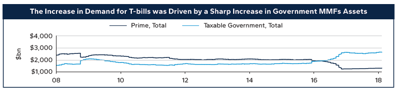 For instance, Treasury increased the bills share in 2016 to accommodate a surge in bill demand as regulatory reform drove money market fund assets from prime (commercial paper) money funds to government-only money funds.