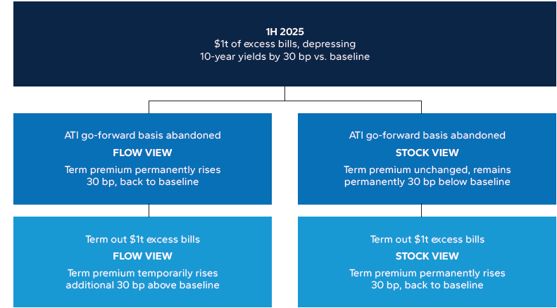 If the flow view is correct, we expect term premia to rise temporarily by 60 bp, before settling back into a permanent 30 bp rise. If the stock view is correct, we expect term premia to permanently rise 30 bp and then stay put.