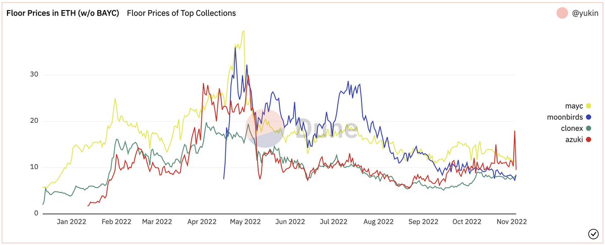 2/ ... although much of the decline is from falling token prices as floors are usually denominated in the L1 token. For example, Eth blue chips - often with diamond-handed holders - saw a considerable decline, but nothing compared to USD terms.
