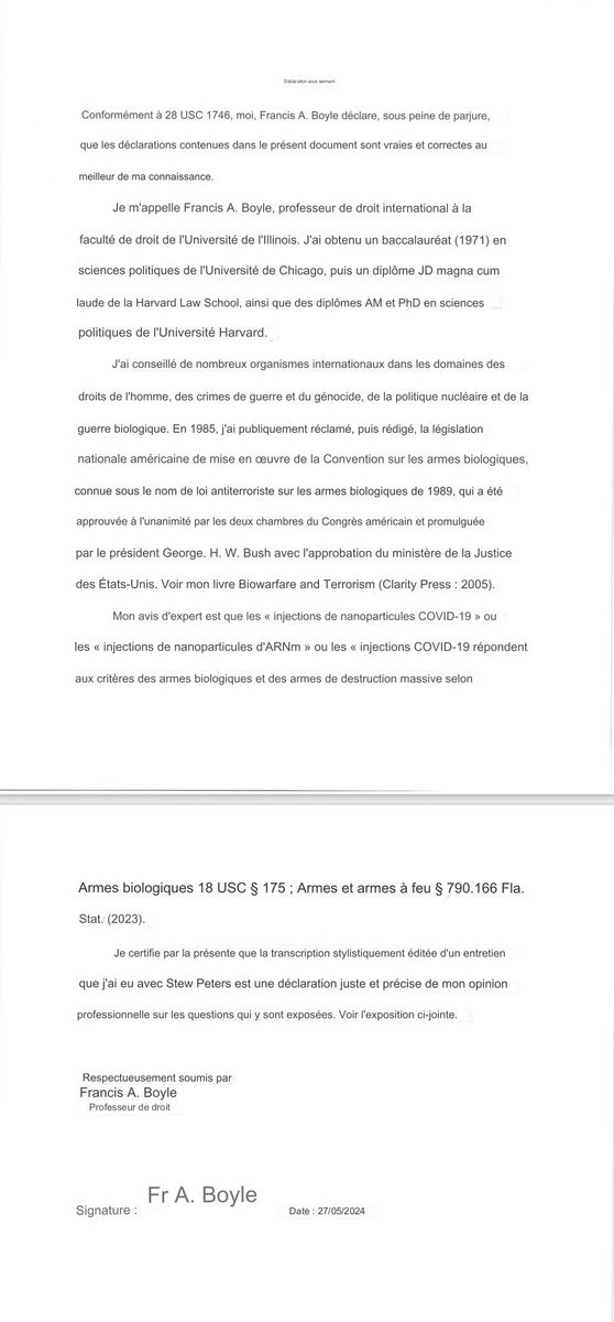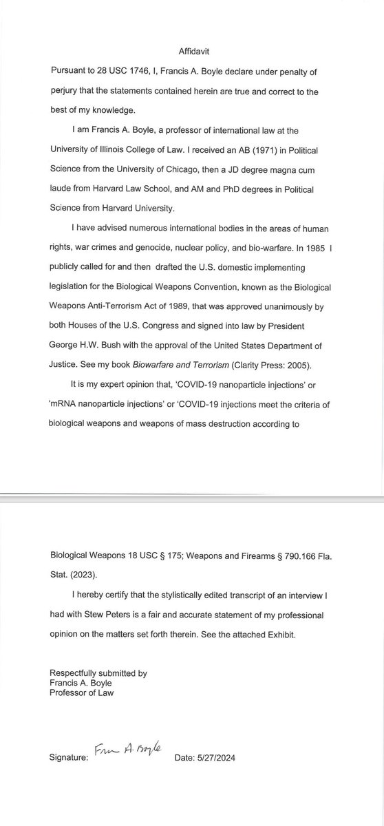Le Pr (droit) Francis A. Boyle, diplômé d'Harvard, auteur de la loi de 1989 sur les armes biologiques aux 🇺🇸, a déclaré le 27/05/2024 sous serment (affidavit) :
