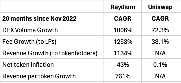 - $RAY has seen much higher token inflation than $UNI but higher orders of magnitude top line growth meant revenue (that accrue to tokenholders) per token still grew 761% CAGR since November 2022.