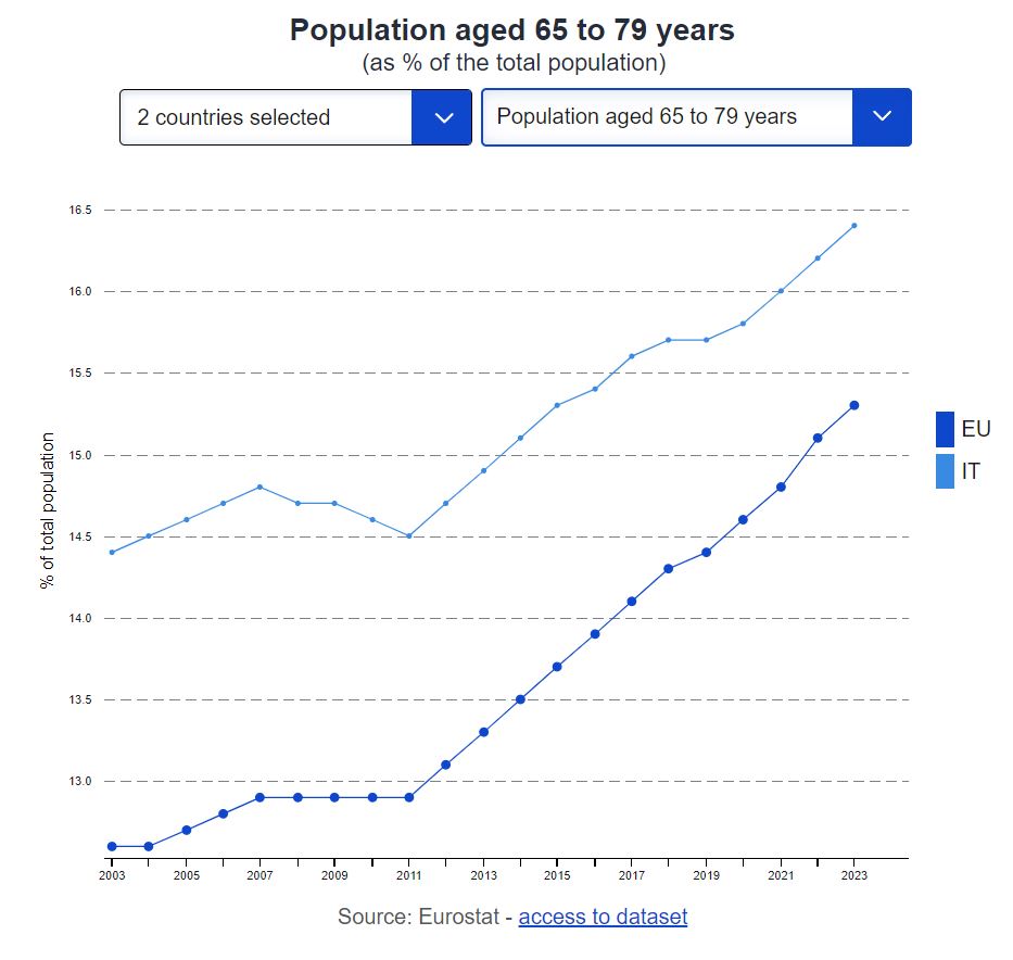 crescita (x popolazione anziana), rispetto alla media dell'Unione Europea. Questo vuol dire che l'Italia si troverà in crisi su multipli fronti (sociali, culturali, economici, ambientali, geopolitici) senza avere una base giovane, in grado di avviare i cambiamenti e gli