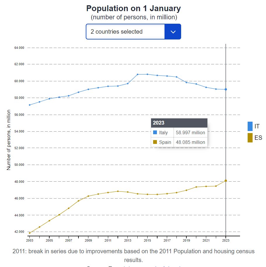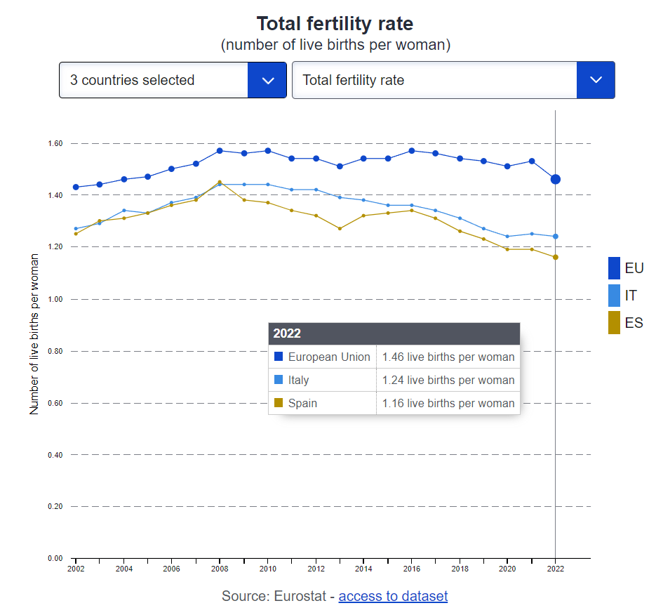 abbiamo uno dei tassi di fecondità più bassi d'Europa (ulteriormente sceso nel 2024 sulla soglia di 1,20 figli x donna), battuti solo dalla Spagna a livello di Paesi similari. Ma proprio la nazione spagnola ha un andamento decisamente diverso rispetto al nostro, dato che