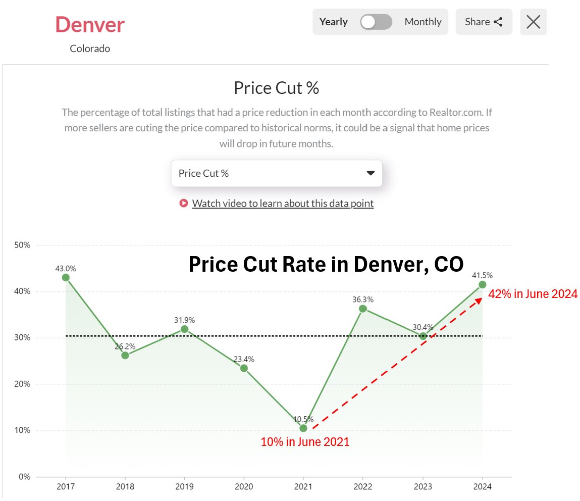 Take Denver. Where the price cut rate just hit 42% of all listings in June 2024.