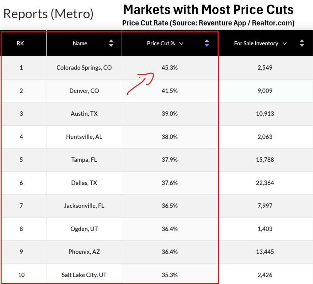 Colorado Springs comes in at #1 with 45% price cut rate. Indicating heavy downward price pressure.