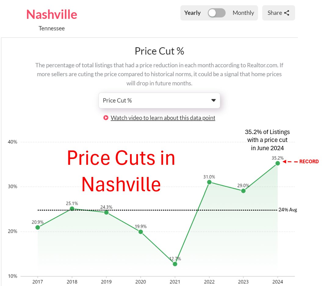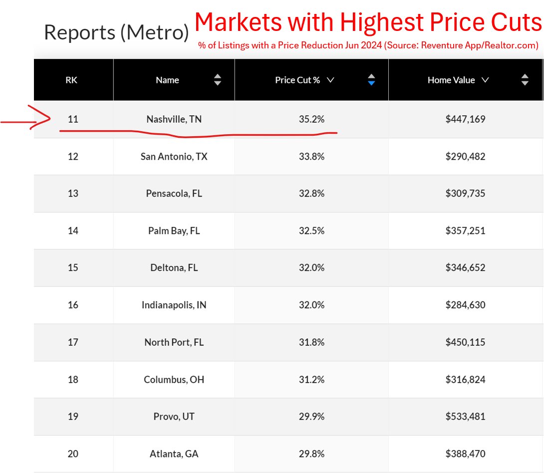 2) Nashville ranks as the #11 metro with the most price cuts as of June 2024.