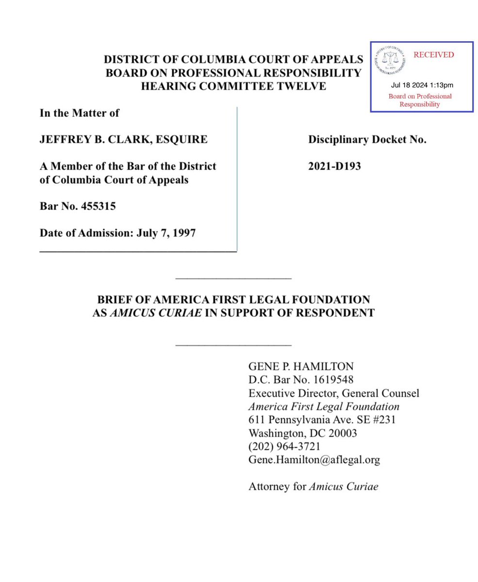 /1 We filed an amicus brief to support @JeffClarkUS, arguing that the proceedings seeking to disbar him should be discontinued immediately based upon SCOTUS’ recent decision in Trump v. United States.
