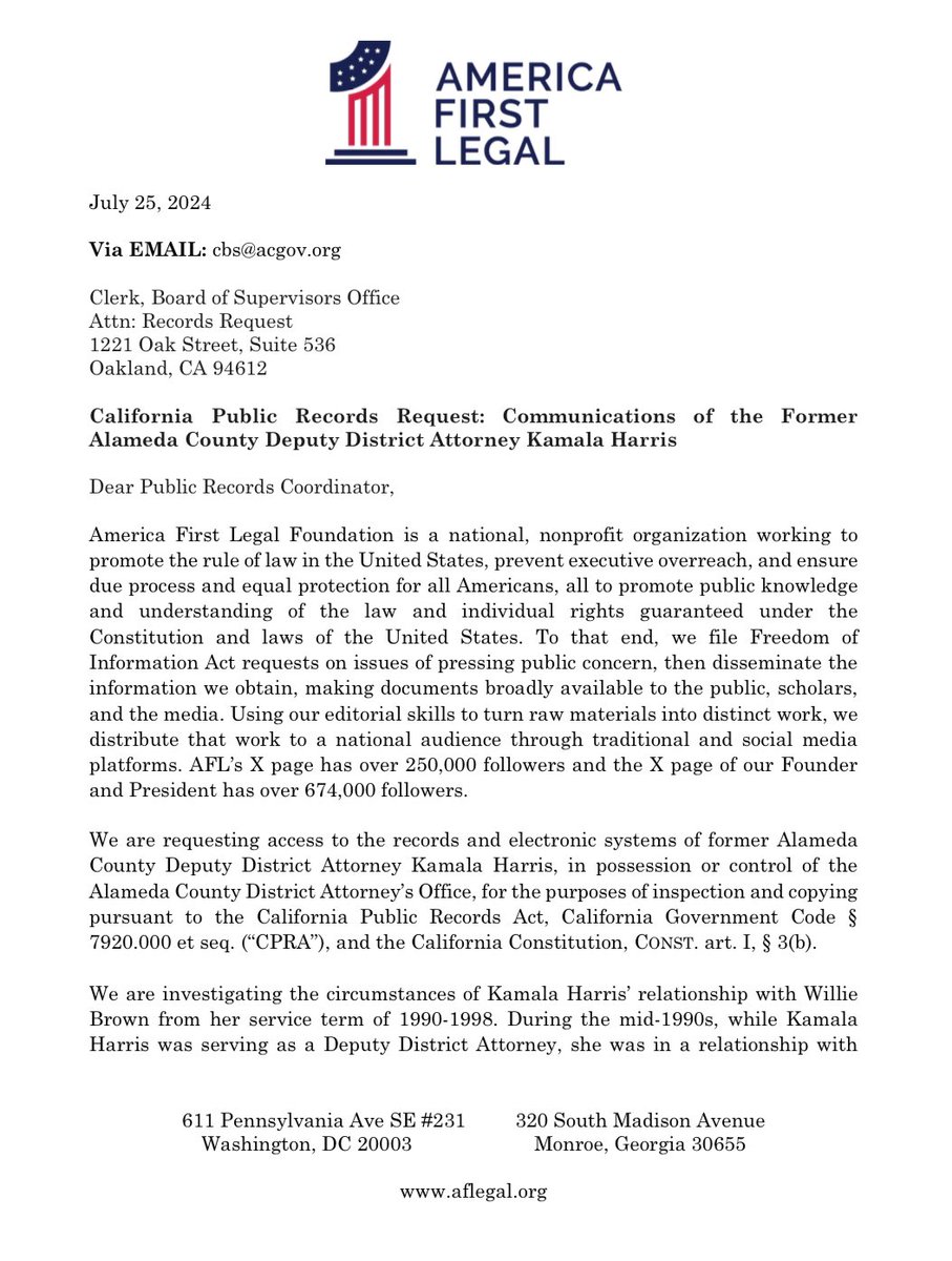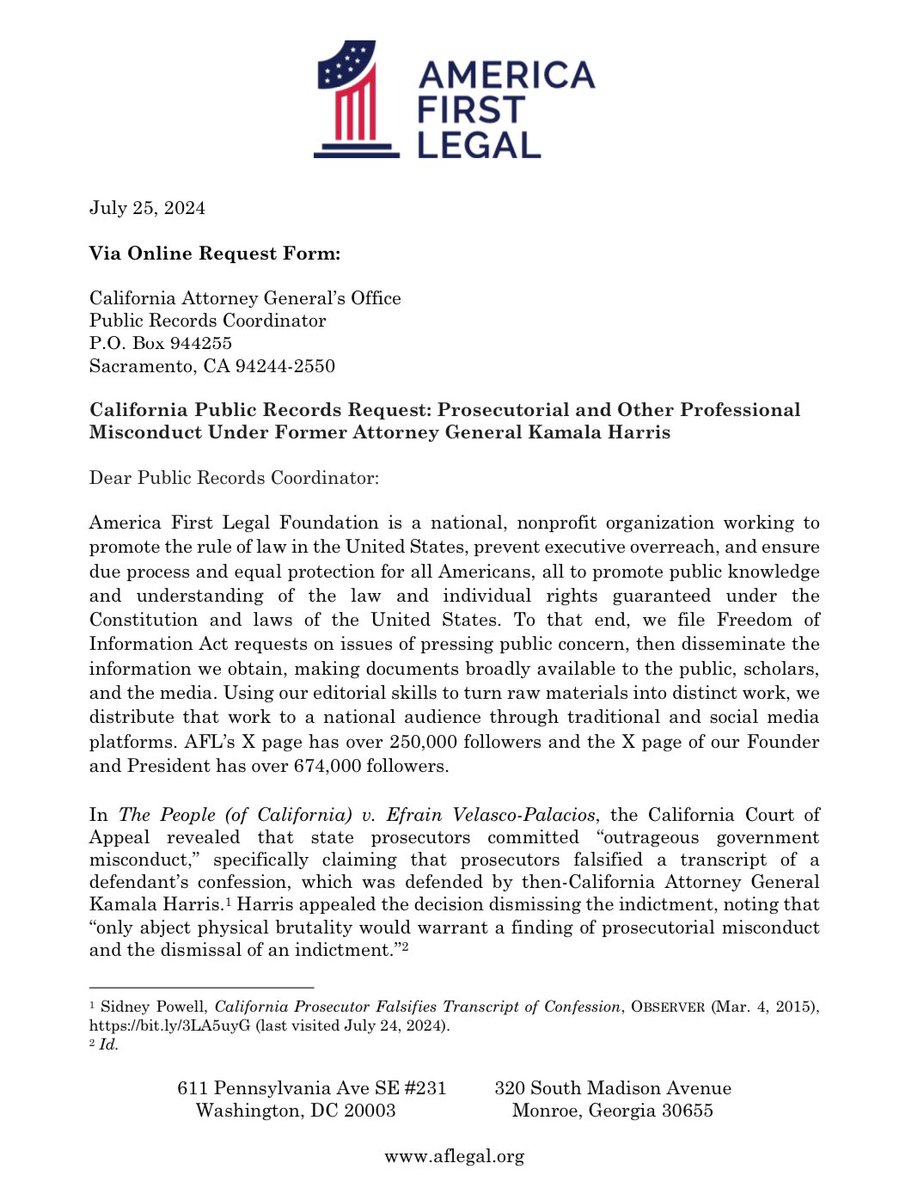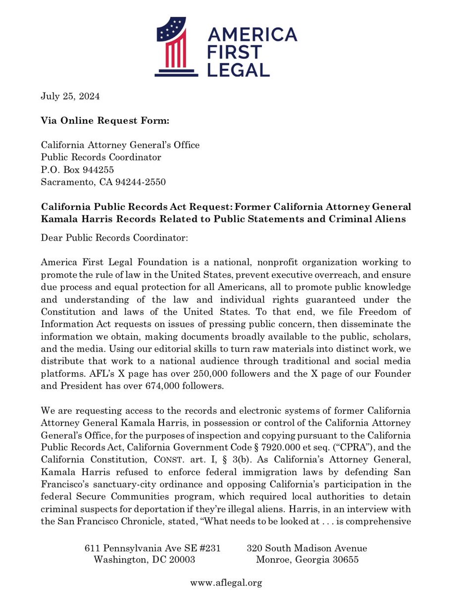 /6 Accordingly, we have launched a multi-front investigation into Kamala Harris to uncover records and communications regarding the following activities during her time serving in the State of California’s government.