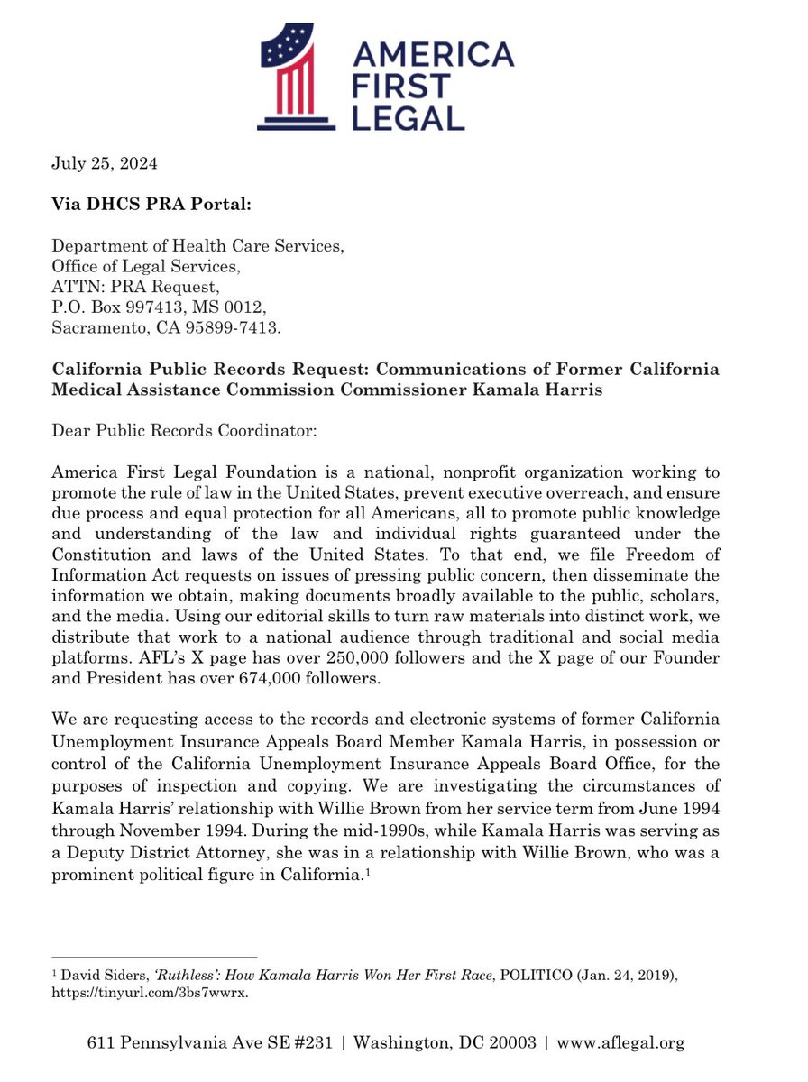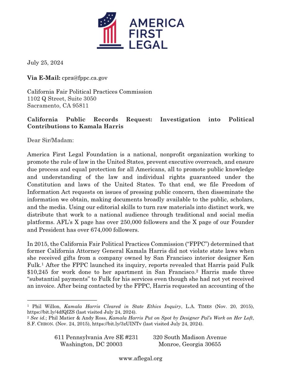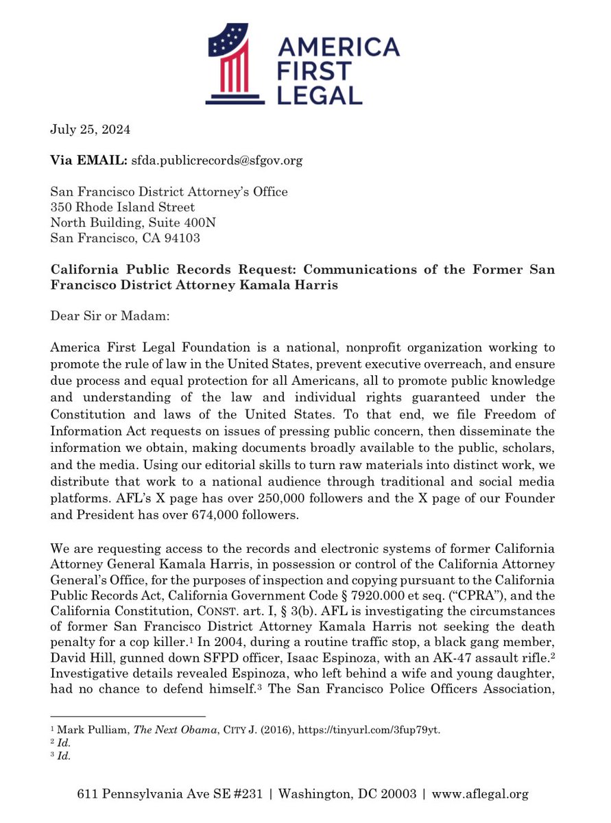 /6 Accordingly, we have launched a multi-front investigation into Kamala Harris to uncover records and communications regarding the following activities during her time serving in the State of California’s government.