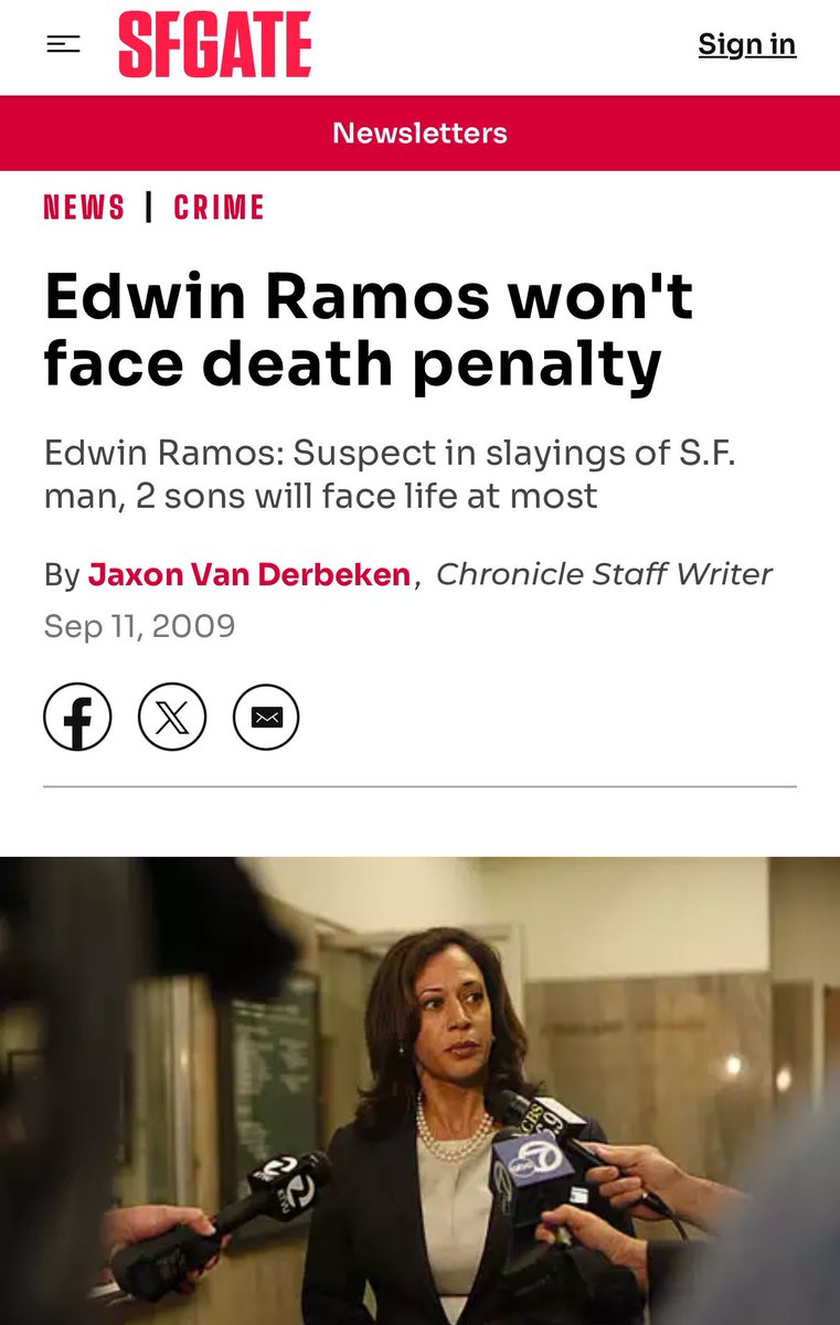 /16 Similarly, in 2009, DA Harris announced that she would seek life imprisonment, rather than capital punishment, against Edwin Ramos, an illegal alien from El Salvador and MS-13 gang member who murdered a father and two of his sons in a drive-by shooting the year before (a third son, critically wounded, survived). The victims were returning home from a family picnic when Ramos opened fire, apparently mistaking them for gang rivals.
