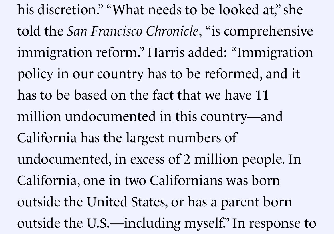 /11 Beyond Harris' lax enforcement of immigration laws, “in 2014, Harris agreed to a settlement with Rodney Quine, a litigious transgender prisoner serving a life sentence for murder without the possibility of parole, allowing him to have a costly sex-change operation at taxpayer expense. Quine’s attorneys argued that forcing him to retain the genitals he was born with while in prison violated the Eighth Amendment’s ban on ‘cruel and unusual punishment.’” Harris praised the settlement.