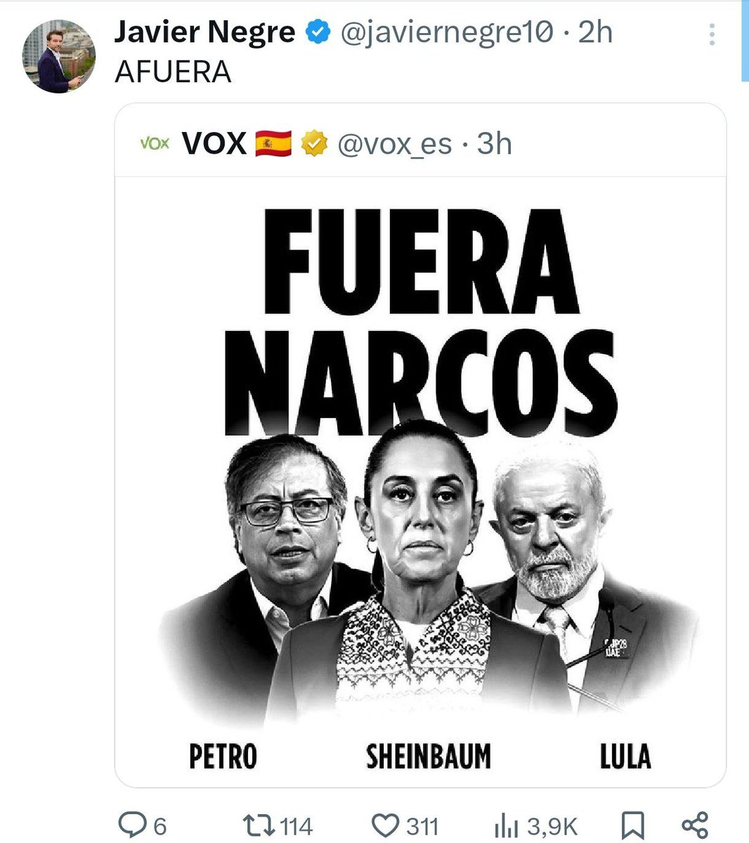 De manera coordinada VOX, Ayuso y algunos profesionales de la mentira como Negre llevan repitiendo este mantra sin ninguna prueba. Ayuso lo usó para criticar el foro progresista vs su reunión con María Corina Machado.