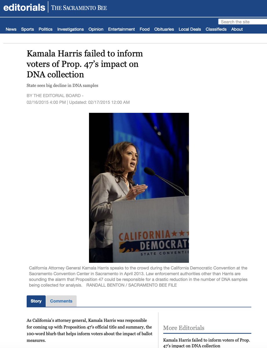 As California's Attorney General at the time, Harris wrote the 100-word summary for voters. And, as AG, she oversaw the lab that analyzes DNA.