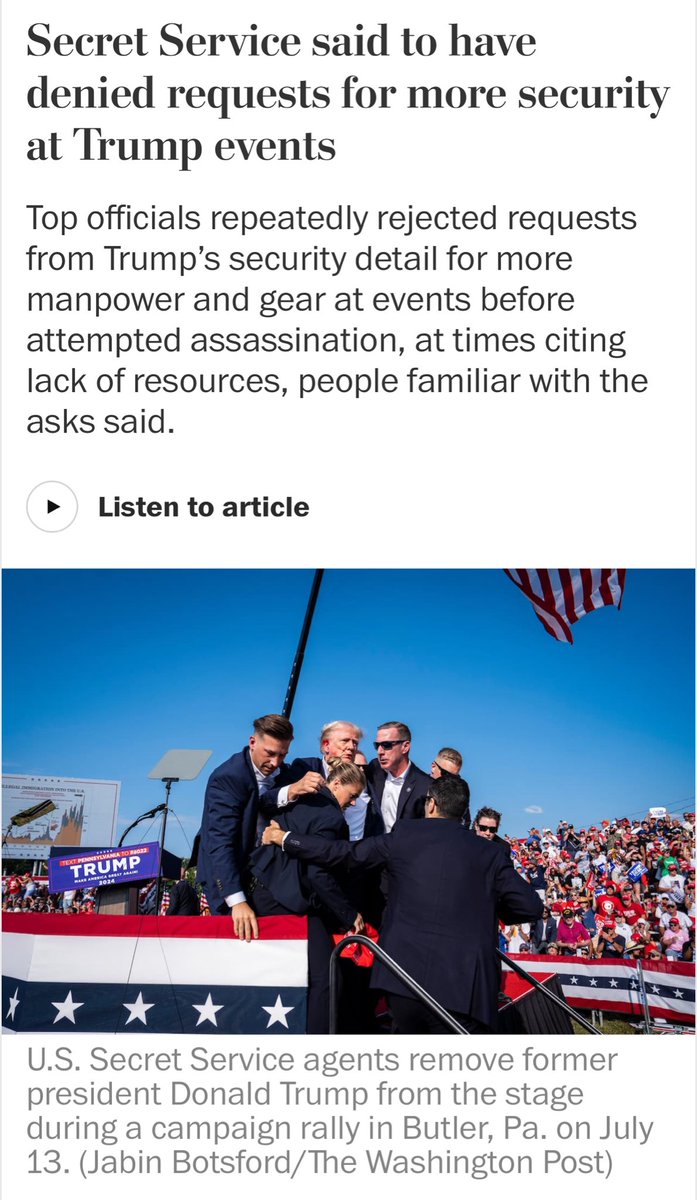 After the assassination attempt, the Secret Service said it hadn’t denied repeated requests by Trump’s security detail for more help. It lied. Now the @nytimes and @washingtonpost have confirmed our reporting and vindicated @dbongino. What else is being covered up?