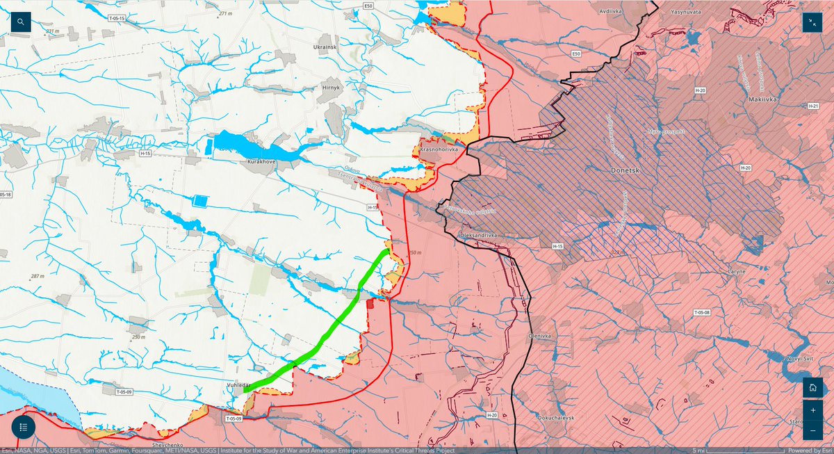 5/ Russian sources have long identified interdicting the T-0524 highway (green) and disrupting Ukrainian ground lines of communication (GLOCs) into Vuhledar as a primary tactical objective in this direction.