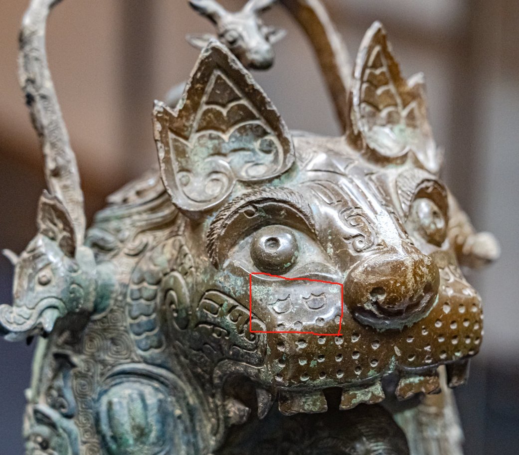 湖南宁乡出土的“西王母育孺帝卣”——文盲们妄称“虎食人卣”,西王母的眼睛下面就是两个圣书体象形文字——
