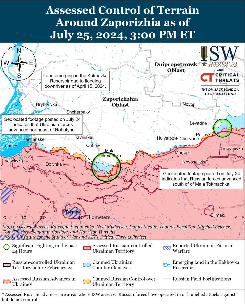4/ Russian and Ukrainian forces recently marginally advanced amid continued positional fighting in western Zaporizhia Oblast on July 25.