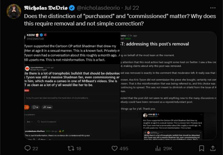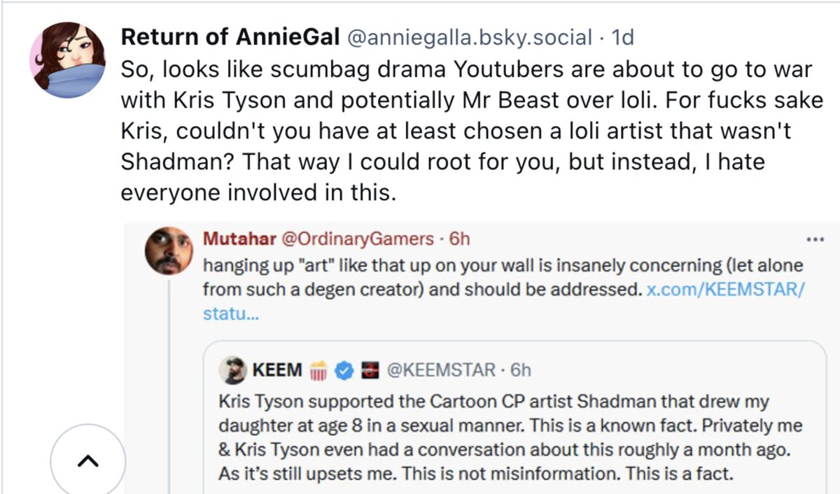@KiwiFarmsDotNet The plot thickens. Chris' defenders tried to minimize the fact he purchased Loli (cartoon child porn) from Shadman by attempting to make the argument that it's not pedophilia if Chris purchased the art versus if Chris had commissioned the art.