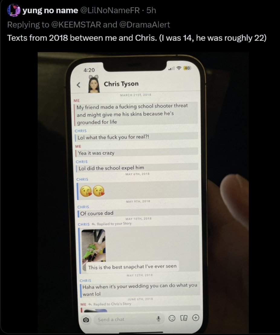 @LilNoNameFR Close up of the message that Chris allegedly sent the 14 year old at the time, @LilNoNameFR, back in 2018