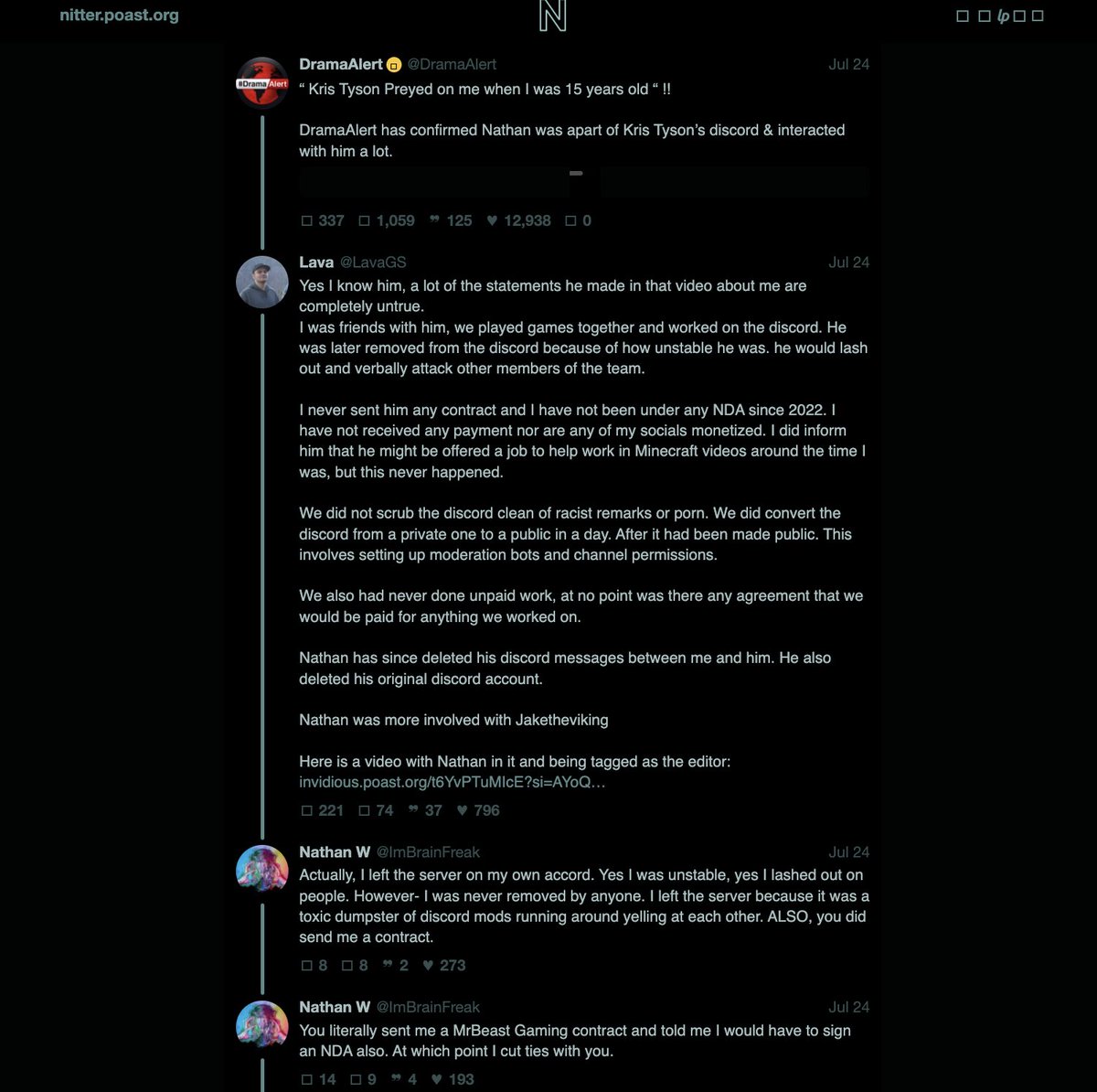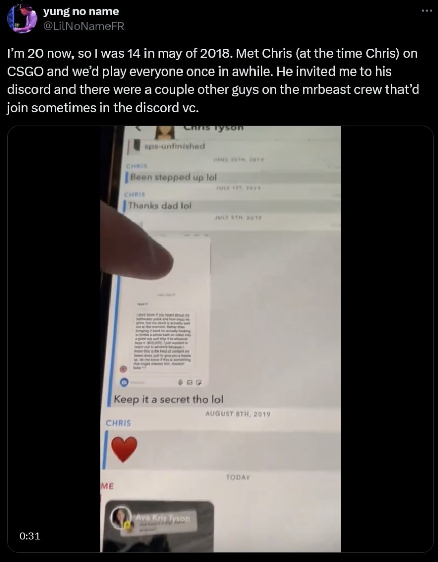 Well this answers the above question. Lava was likely groomed by Chris Tyson as alleged by Tyson's other victim, Nathan W, but Lava likely did a cost benefit analysis, expose Chris or lose his position working for MrBeast. Clearly losing his position with MrBeast would mean there is far greater downside to exposing Chris than upside. I'm betting he did that calculation and was attempting to save his job within the organization, but clearly at the cost of selling the other victims down the river.