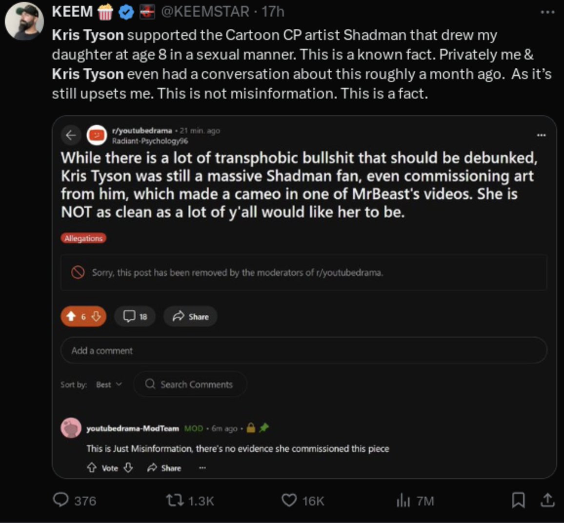 Users on @KiwiFarmsDotNet are alleging that the reason that Chris Tyson was not exposed a year ago is because MrBeast was still working with Night Media when this started first coming out.