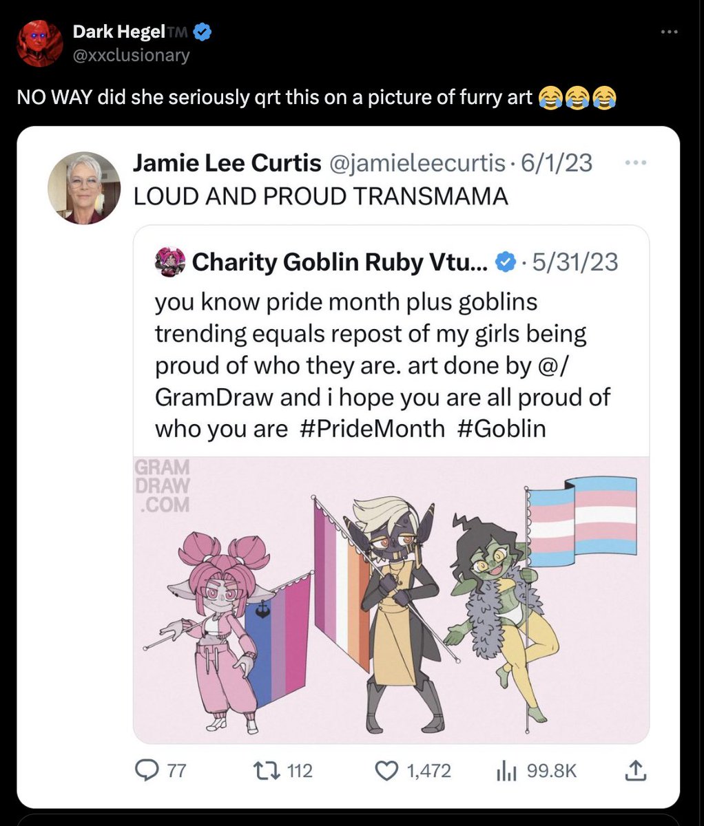 @KiwiFarmsDotNet Now may be an appropriate time to point out that Jaime Lee Curtis' son, who identifies as a woman, is into an adjacent genre of cartoon pornography as Chris Tyson.