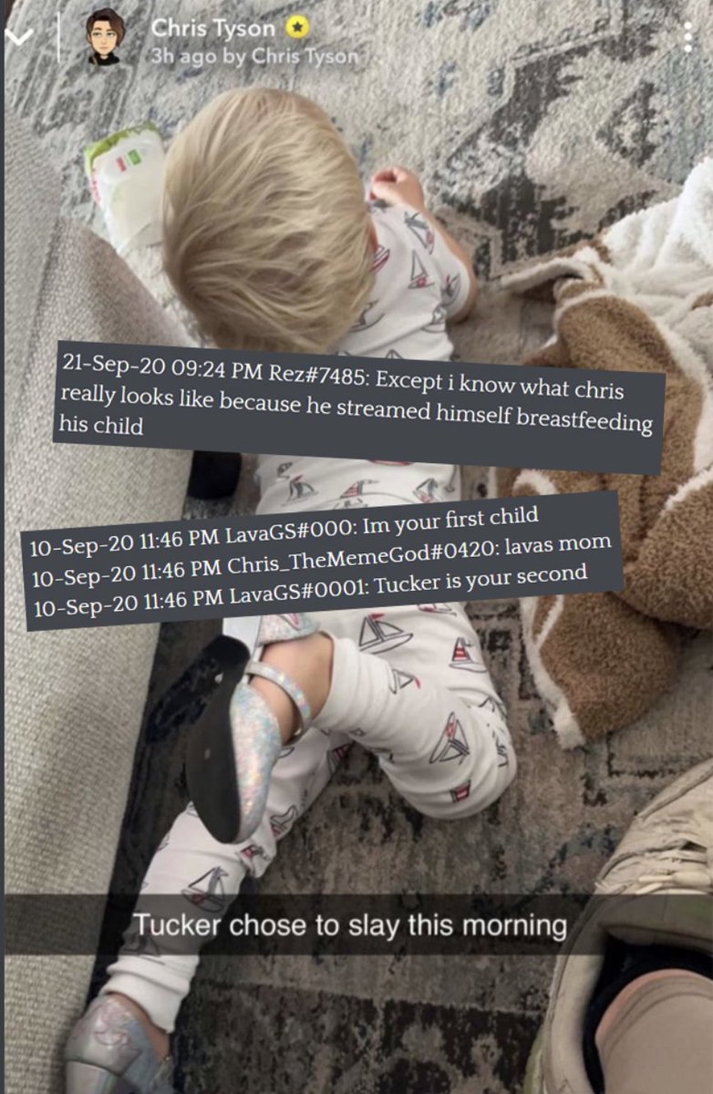 @KiwiFarmsDotNet Chats from the recently linked MrBeast staff discord chat accompanying an image Chris Tyson posted of his son on his snapchat story.